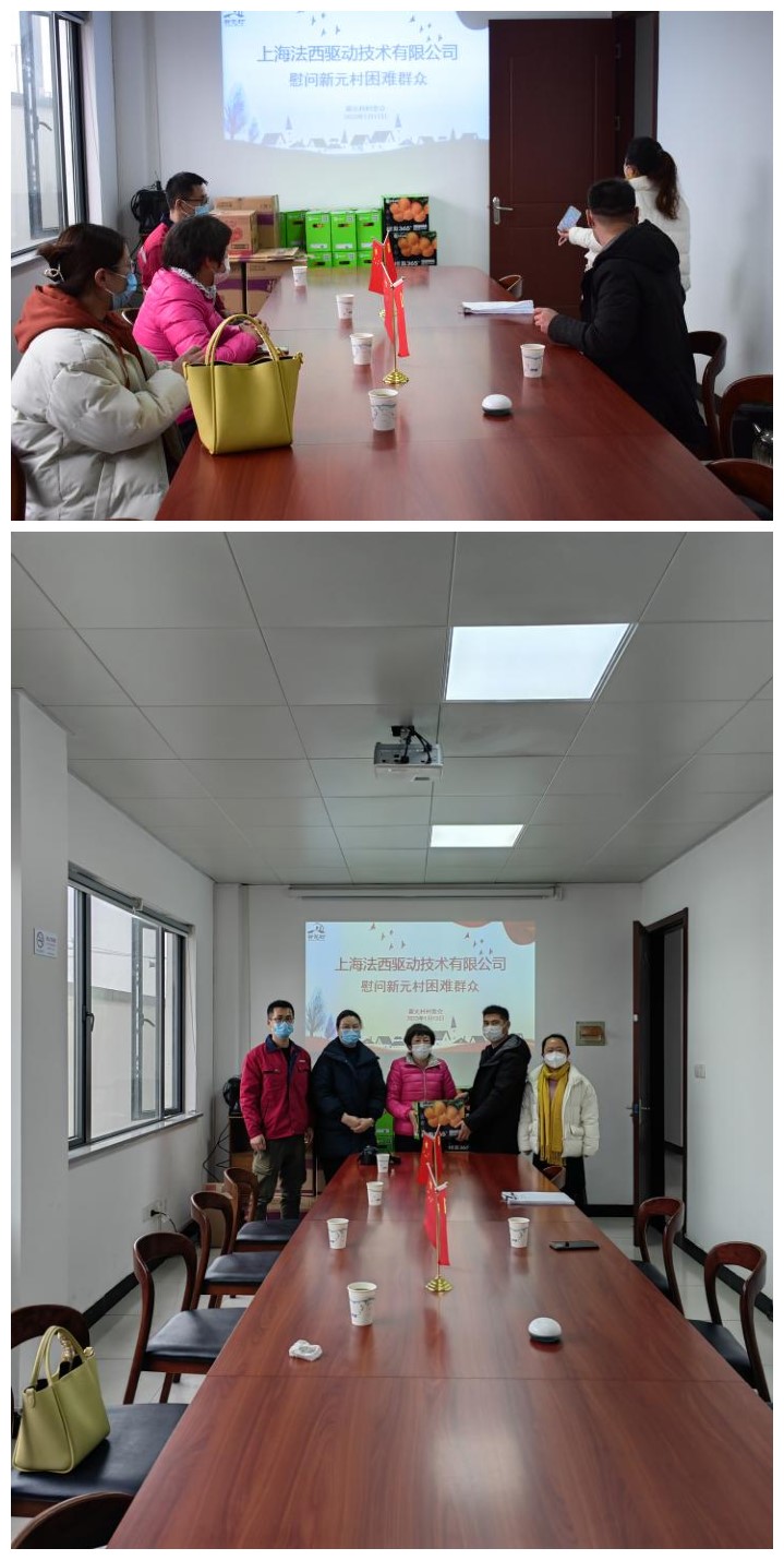为了让贫困群众度过一个欢乐、暖心的新年,1月13日,上海法西驱动技术有限公司工会主席带领行政部等部门领导一行到新元村走访慰问贫困户,并送上大米、油、水果礼盒等生活物资,提前为他们送上了新年的祝福和问候,及时将企业的一份深切关怀送到贫困群众的心坎上。 慰问组一行来到新元村村委会,与新元村沈书记亲切交谈,了解贫困群众的家庭收入、自种自养项目以及身体健康状况。并仔细询问了当前有无困难,全面了解他们的生活状态,鼓励他们增强信心,克服困难,依托党的好政策,靠自己勤劳的双手拓宽收入渠道,早日实现脱贫。 多年来,镇人大一直坚持送温暖等慰问活动,把改善民生问题落到实处,同时带动我们企业参与到弱势群体的关怀帮扶工作中来,体现企业的社会责任感,此次的走访慰问活动,虽然送去的东西不多,不能改变困难户的生活窘境,但这份"关爱"是春节前最温暖的礼物,不仅温暖困难户的心灵,更是拉近了企业与困难群众的距离,营造了良好的帮扶助困社会氛围,同时实实在在地让困难群众受到了党和政府的关怀与温暖,让他们感受到社区大家庭的温暖。