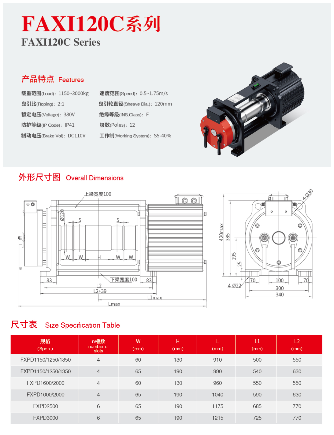 FAXI120C系列主机特点描述: 1、适用于大载重无机房电梯; 2、钢带从主导轨两侧分布,轿厢静平衡更好; 3、采用64KN的钢带,钢带宽度36mm,安全有保障; 4、可提供钢带、导轮、带夹、断丝检测。