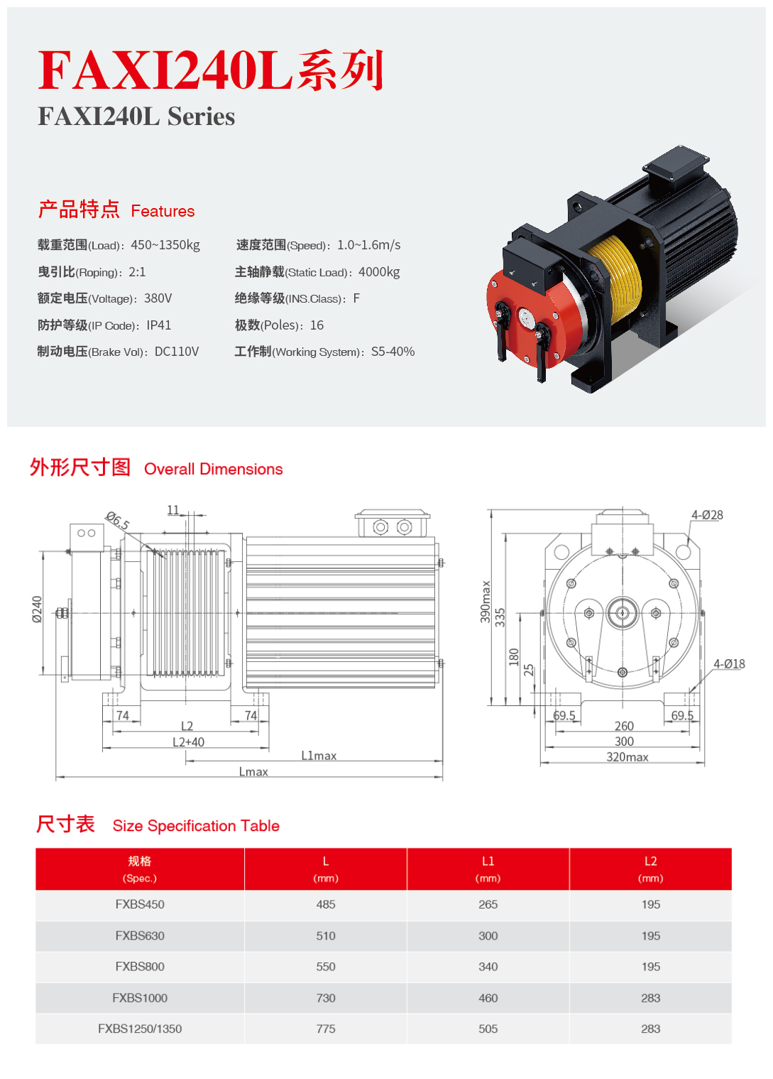 可采用6mm、6.5mm钢丝绳,承载力大,结构紧凑,外形精巧,噪音低,一般用于海外客梯项目。