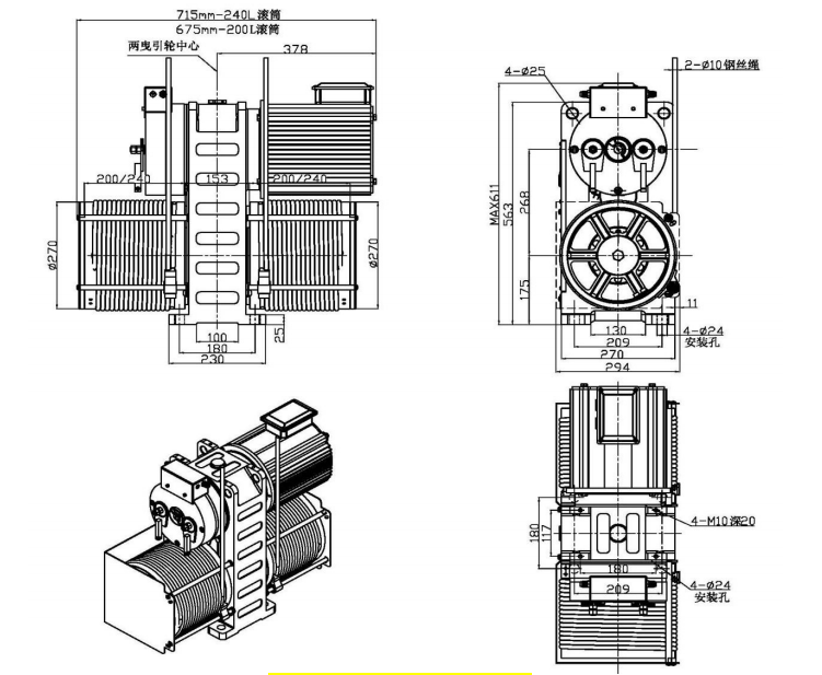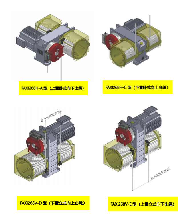 4、强驱主机可以安装在井道的顶部,也可以安装在井道的底部,且出绳方式多样,满足不同井道的特殊安装.