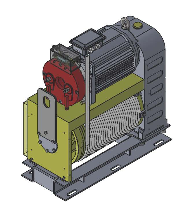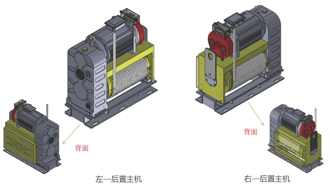 3)滚筒为右旋双头滚筒,滚筒的两端都可固定钢丝绳,当钢丝绳固定在滚筒电机后侧,从箱体侧出绳—左-后置主机,钢丝绳固定在滚筒靠近箱体侧,从电机后端出绳—右-后置主机.