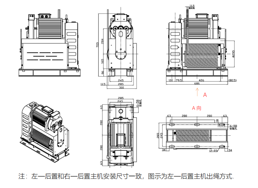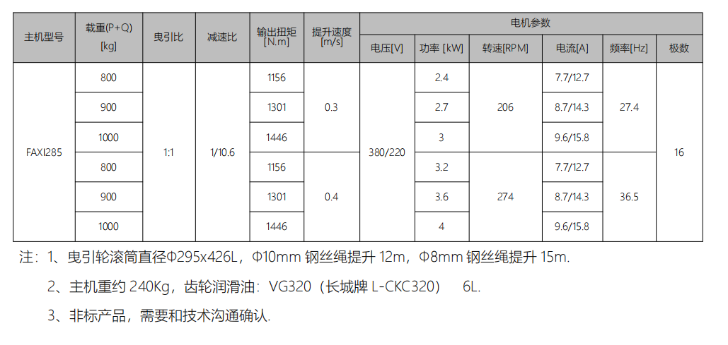 3)滚筒为右旋双头滚筒,滚筒的两端都可固定钢丝绳,当钢丝绳固定在滚筒电机后侧,从箱体侧出绳—左-后置主机,钢丝绳固定在滚筒靠近箱体侧,从电机后端出绳—右-后置主机.FAXI285 主机主要参数: