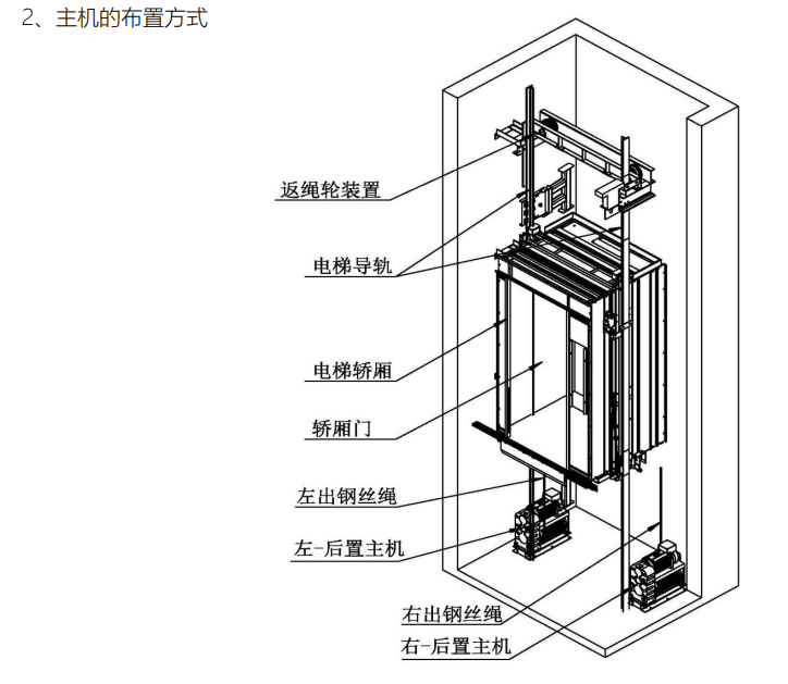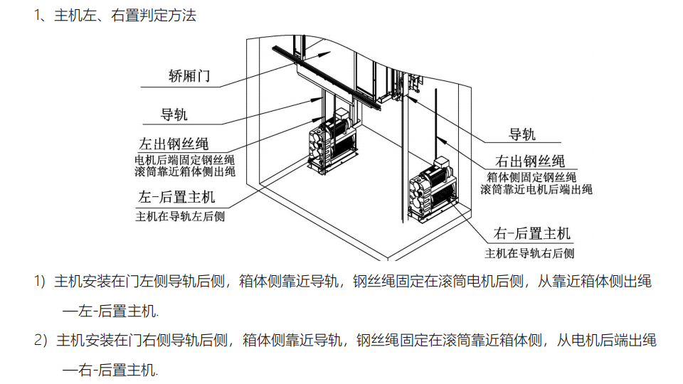 2)主机结构对称,一种机型,两种安装方式:即可安装在门左侧导轨后(左-后置主机),也可安装在门右侧导轨后(右-后置主机).