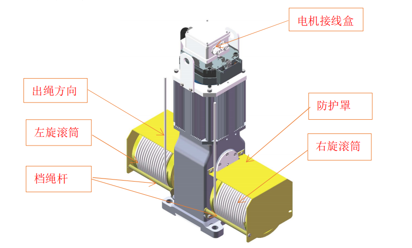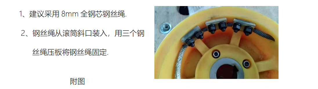 3、安装时,建议钢丝绳出绳方向朝井道墙壁,以便最大的利用空间.