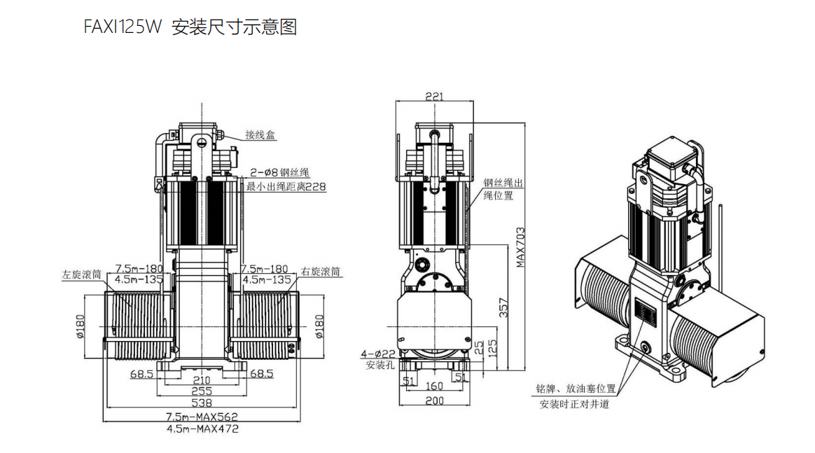 2、当钢丝绳绕满滚筒预留1.5圈时,两滚筒最小出绳距离为228mm.