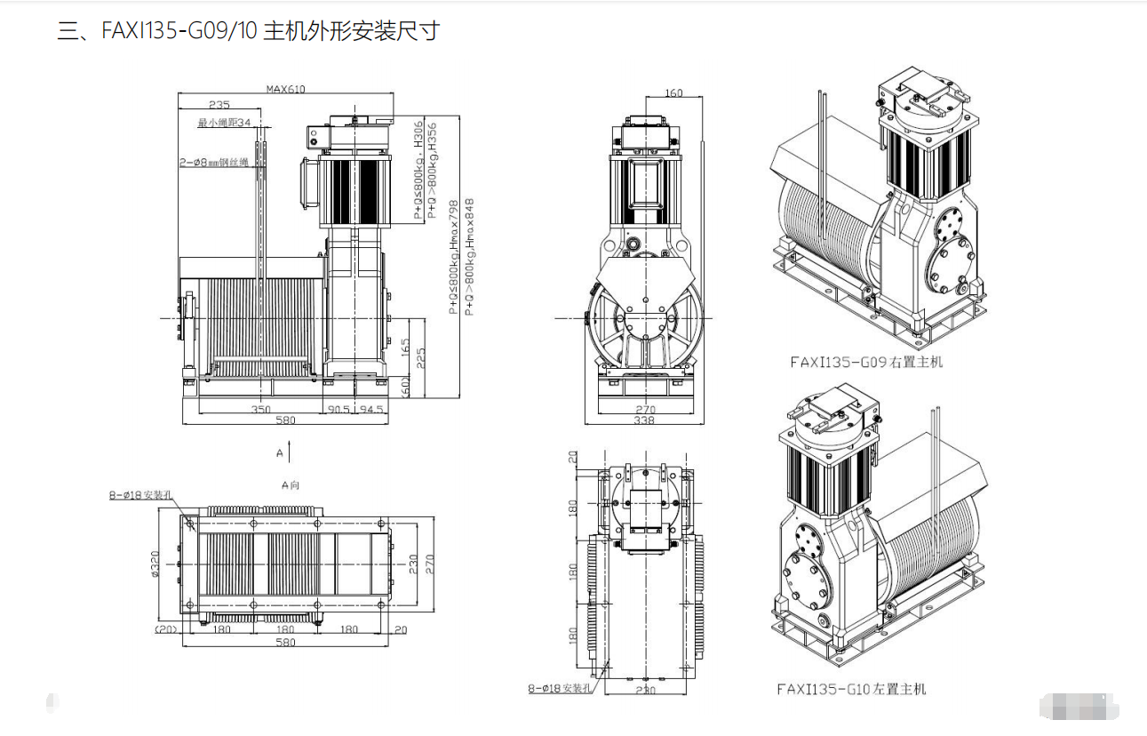 注: 1)主机安装在轿厢左侧的主机,为左置主机:主机安装在轿厢右侧的主机,为右置主机. 左置主机和右置主机都可以当作后置主机使用. 2)订货时,必须注明主机的类型,以免安装方向错误. 3)主机外形图为钢丝绳缠满是的外形图.